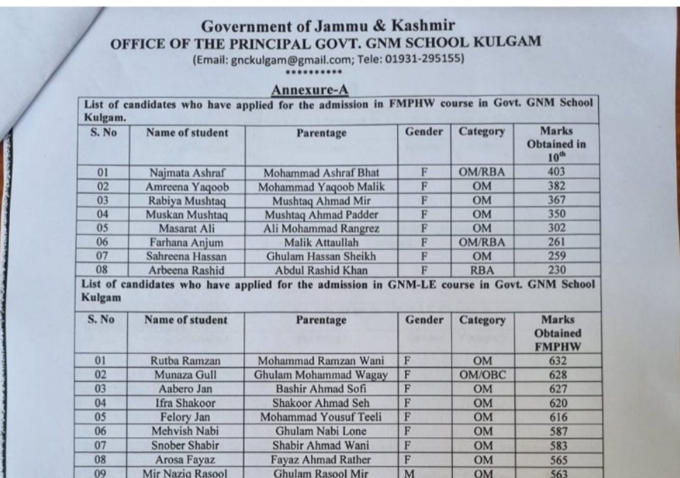 It is for the information of all stakeholders that the merit list of the candidates who have applied for the admission in FMPHW, GNM & GNM-LE in Govt. GNM School Kulgam is annexed with this notice as Annexure “A” and the selection list of candidates for the admission in FMPHW, GNM & GNM-LE in Govt. GNM School Kulgam is attached as Annexure “B”